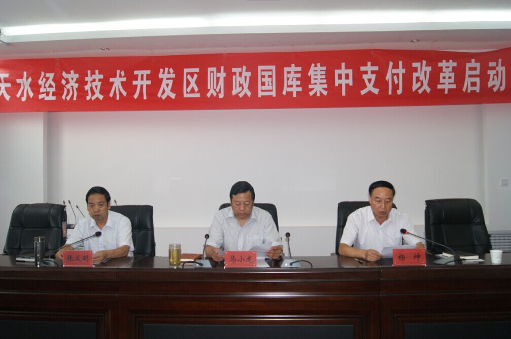 7月29日,天水經(jīng)濟(jì)技術(shù)開發(fā)區(qū)管理委員會組織召開財(cái)政國庫集中支付制度改革啟動會議,開發(fā)區(qū)黨工委書記、管委會主任馬小龍,管委會副主任楊坤、張義明出席會議,來自開發(fā)區(qū)管委會機(jī)關(guān)、直屬單位和國土、公安、工商、國稅、地稅、質(zhì)監(jiān)以及東十里、二十鋪、下曲、東柯河四個(gè)工業(yè)園的負(fù)責(zé)人、財(cái)務(wù)人員參加了會議,中國建設(shè)銀行、蘭州銀行作為協(xié)作方也參加了會議。