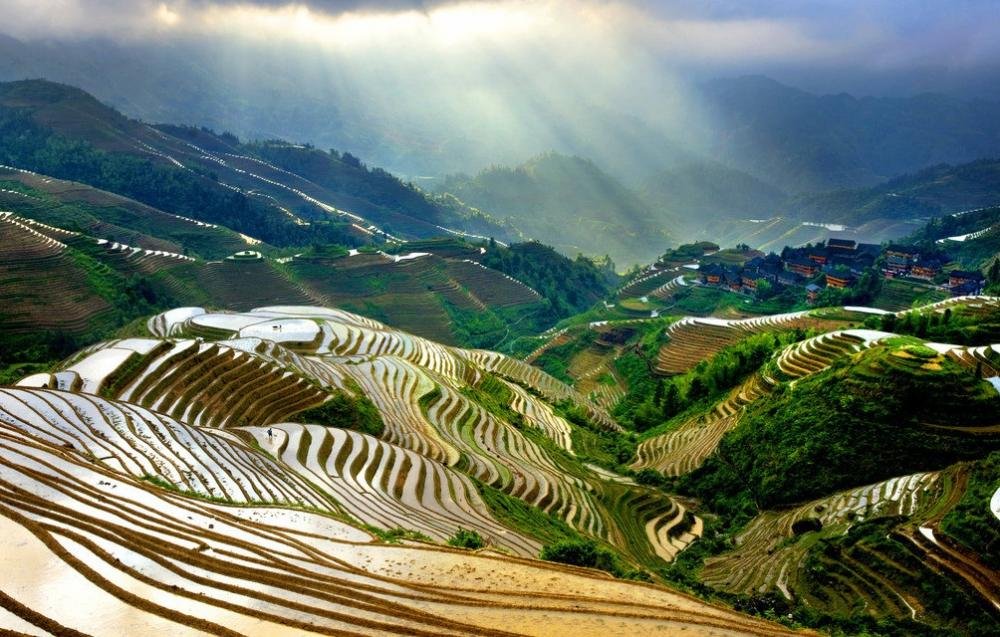 龍脊梯田,在廣西龍勝各族自治縣和平鄉(xiāng)平安村龍脊山,距縣城22公里。距桂林市80公里。從山腳盤(pán)繞到山頂,小山如螺,大山似塔,層層疊疊,高低錯(cuò)落。從高處望去,梯田的優(yōu)美曲線(xiàn)一條條、一根根、或平行或交叉,蜿蜒如春螺、披嵐似云塔,顯示了動(dòng)人心魄的曲線(xiàn)美。其線(xiàn)條行云流水,瀟灑柔暢;其規(guī)模磅礴壯觀,氣勢(shì)恢宏。