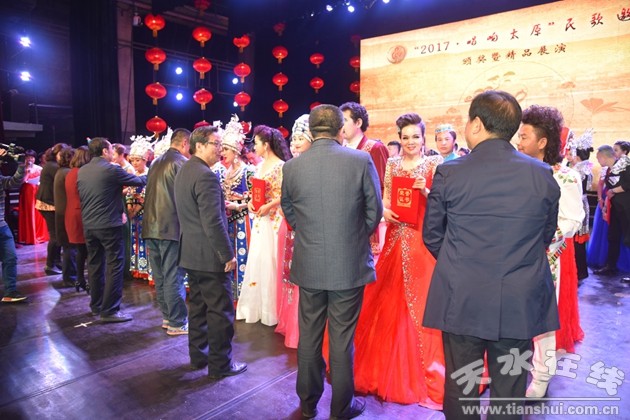 天水市文化館專門組隊參加了本次民歌大賽并獲得了優(yōu)異的成績。由市文化館王小艷演唱的原創(chuàng)歌曲《羲皇故里》榮獲一等獎,天水市歌舞研究中心蘇珍祥演唱的歌曲《甘肅老家》、麥積區(qū)文化館李青演唱的歌曲《黃河漁娘》分別榮獲二等獎。三位選手以精湛的演唱、完美的舞臺表現(xiàn)力獲得了評委、各參賽隊的一致好評。