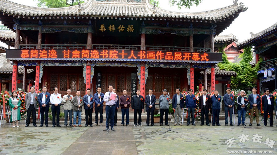 由天水市文化館、天水市書法家協(xié)會主辦,甘肅簡逸書院承辦的本次書畫展,共展出書畫作品120件。十位書畫家是甘肅簡逸書院的謝福善、陳黎、張旭瑞、云智平、石泉新、王小龍、王維紅、王維新、原田林、裴樹仁。