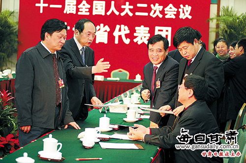 3月7日,出席十一屆全國人大二次會議的甘肅團代表繼續(xù)審議政府工作報告。會議結(jié)束后,企業(yè)界代表還就擴內(nèi)需、保增長,增強企業(yè)競爭力,戰(zhàn)勝金融危機等問題熱烈討論著。本報記者呂建榮攝