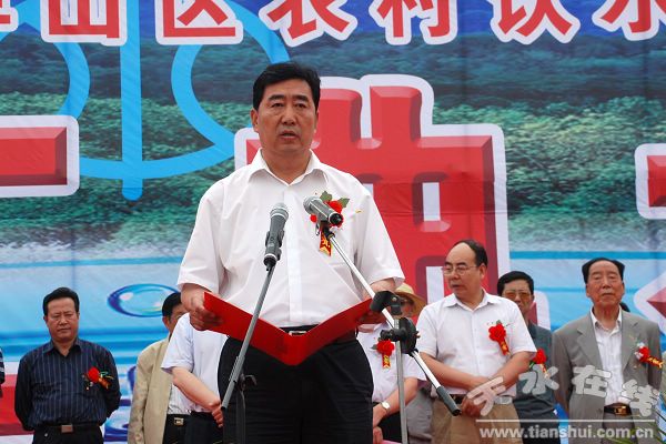 市委書記、市人大常委會(huì)主任張景輝在開(kāi)工典禮上講話,他首先代表市四大組織向工程的開(kāi)工表示熱烈祝賀。張景輝指出,甘谷縣西北部農(nóng)村飲水安全工程是黨和政府堅(jiān)持以人為本,對(duì)貧困干旱地區(qū)人民群眾深切關(guān)懷的具體體現(xiàn),全市各有關(guān)部門和單位一定要結(jié)合學(xué)習(xí)實(shí)踐科學(xué)發(fā)展觀活動(dòng)的深入開(kāi)展,從各自職能出發(fā),主動(dòng)協(xié)調(diào)配合,積極支持甘谷縣實(shí)施好這個(gè)項(xiàng)目。甘谷縣委、縣政府要把這項(xiàng)惠及西北部干旱區(qū)群眾的民生工程、德政工程放在全縣項(xiàng)目工作的突出位置,加強(qiáng)領(lǐng)導(dǎo),精心組織,強(qiáng)化監(jiān)管,規(guī)范建設(shè),切實(shí)把好安全關(guān)、質(zhì)量關(guān)、進(jìn)度關(guān)、廉政關(guān),在保證質(zhì)量的前提下加快建設(shè)進(jìn)度,確保受益區(qū)群眾早日吃上安全、干凈、放心的自來(lái)水,切實(shí)提高生活質(zhì)量和水平。