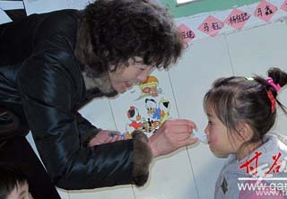 (縣委副書(shū)記、縣長(zhǎng)賈忠慧在姚莊幼兒園為適齡兒童服“糖丸”疫苗)