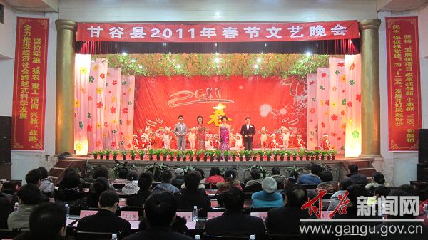 1月26日晚,甘谷縣2011年春節(jié)聯(lián)歡晚會在縣委禮堂隆重上演?h委書記溫利平,縣人大常委會主任衡彬,縣委副書記、縣長賈忠慧,縣政協(xié)主席王璽卿等縣四大組織在家領導與廣大干部群眾歡聚一堂,觀看演出,共慶新春佳節(jié)。