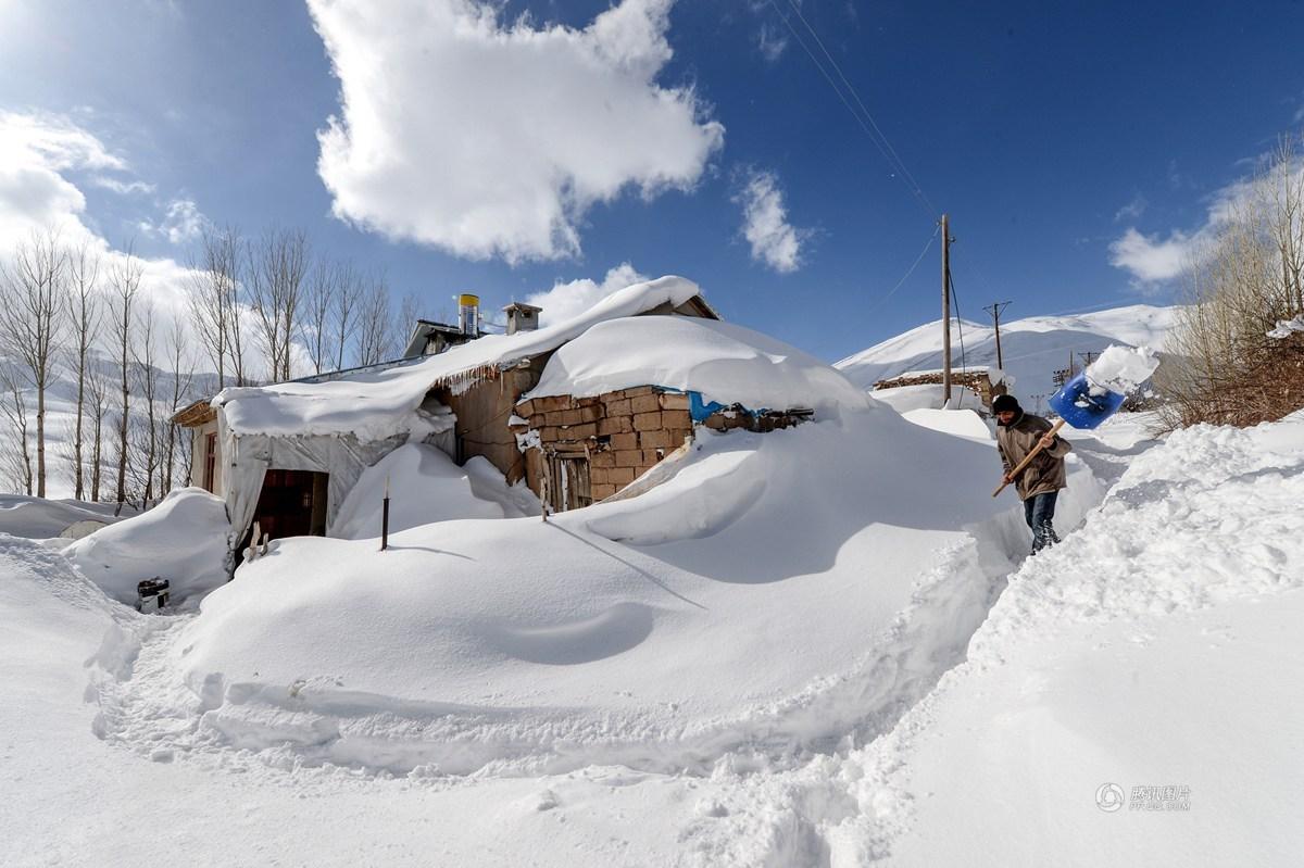 土耳其村莊被大雪淹沒(méi)的房屋。