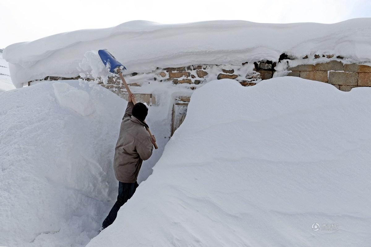 被大雪覆蓋的房屋,村民只能在積雪中挖出一條通道通行。