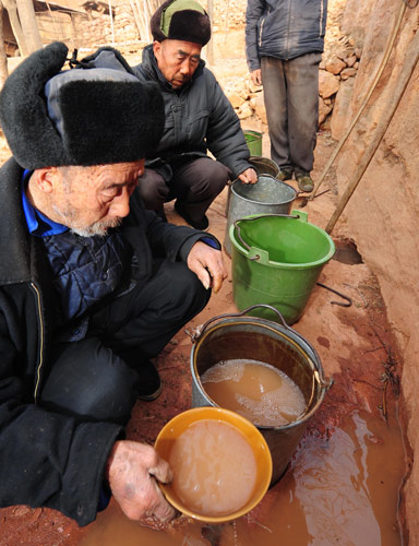 2月4日,河南汝陽(yáng)縣城關(guān)鎮(zhèn)張河村79歲的薛永國(guó)老人(左)正和村民一起在舀山崖下滲出來(lái)的渾濁的水。