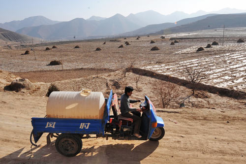 2月5日,甘肅省會(huì)寧縣村民何保健在運(yùn)輸生活用水。自2008年9月以來(lái),甘肅省白銀市會(huì)寧縣持續(xù)干旱,嚴(yán)重旱情給春耕生產(chǎn)和人畜飲水造成困難。