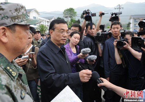 4月20日下午,中國國務(wù)院總理李克強(qiáng)抵達(dá)四川蘆山地震重災(zāi)區(qū)龍門鄉(xiāng)臨時指揮部了解災(zāi)情,并對救災(zāi)作出重要指示。圖為李克強(qiáng)現(xiàn)場通過媒體向受災(zāi)的民眾表示問候。中新社發(fā) 劉忠俊 攝