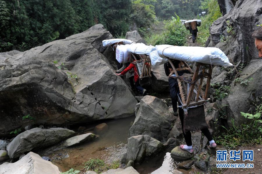 4月22日,石鳳村村民在搬運救災(zāi)援助物資。新華社記者 李紫恒 攝