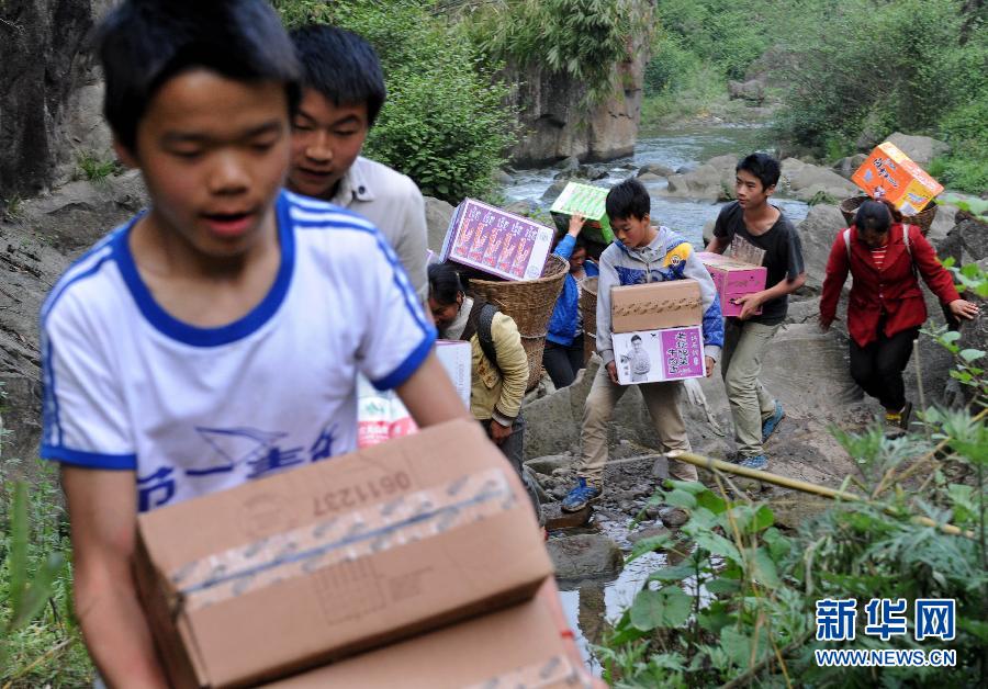 4月22日,石鳳村的學(xué)生在搬運救災(zāi)援助物資。 新華社記者 李紫恒 攝