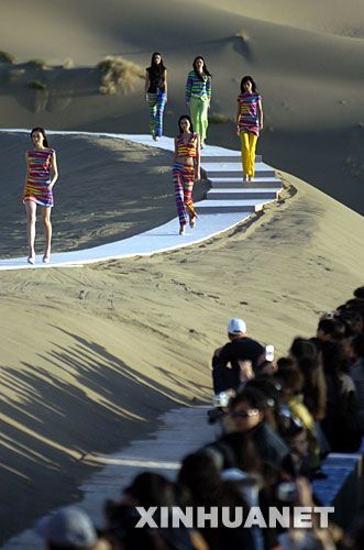 當(dāng)日,某品牌2008春夏時(shí)裝發(fā)布會在甘肅敦煌鳴沙山舉行,