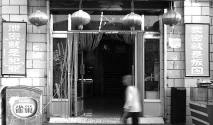 在航天城最大的超市紅旗藍(lán)箭超市門口兩側(cè),一副標(biāo)語(yǔ)頗為引人注目:泄密就是犯罪、賣密就是叛國(guó)!