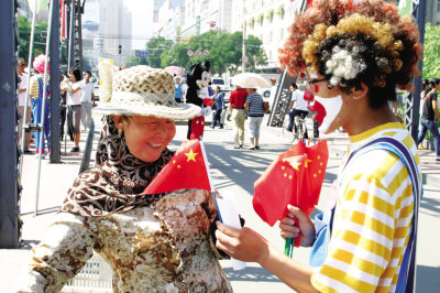 蘭州一家快遞公司的工作人員扮作小丑,以“奧運知識問答”的形式向市民贈送國旗。