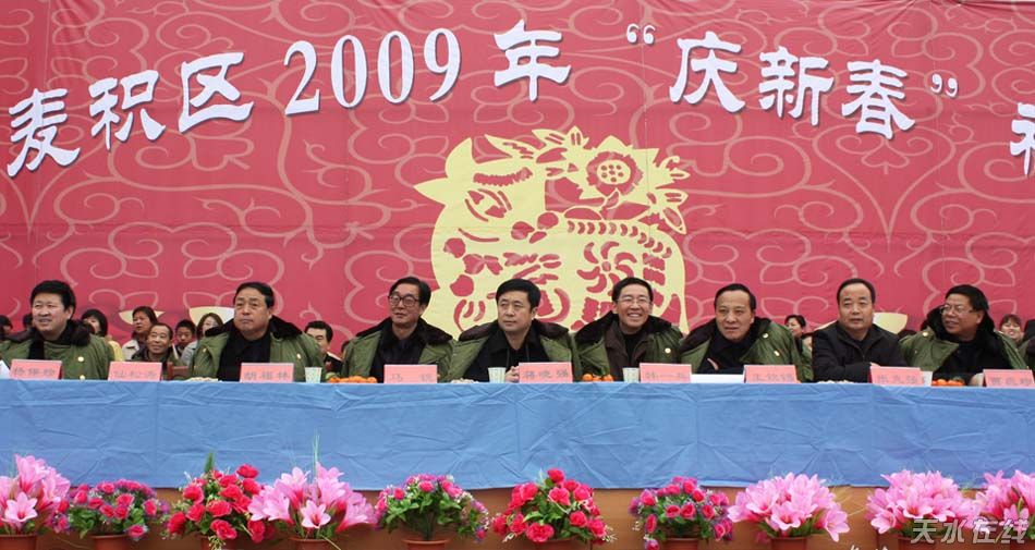 天水市委常委、麥積區(qū)委書(shū)記蔣曉強(qiáng),市人大副主任韓一兵、馬銳,市政協(xié)副主席王欽錫,市委副秘書(shū)長(zhǎng)仙松濤,麥積區(qū)人大常委會(huì)主任胡福林,區(qū)委副書(shū)記、區(qū)長(zhǎng)張克強(qiáng),區(qū)政協(xié)主席賈應(yīng)珍,區(qū)委副書(shū)記楊保珍,區(qū)委常委、副區(qū)長(zhǎng)馬兆讓?zhuān)瑓^(qū)委常委、副區(qū)長(zhǎng)王曉琴,區(qū)委常委、組織部長(zhǎng)楊續(xù)祥,區(qū)委常委、馬跑泉鎮(zhèn)黨委書(shū)記趙曉東,區(qū)委常委、政法委書(shū)記尹首奎,區(qū)委常委、紀(jì)檢委書(shū)記李小敏,區(qū)委常委、宣傳部長(zhǎng)臧志軍,區(qū)委常委、武裝部長(zhǎng)任長(zhǎng)軍,區(qū)人大副主任李加峰、屈光健、馬麗宏、朱懷林,副區(qū)長(zhǎng)謝筱會(huì)、邵長(zhǎng)鋒、楊鐵森等市區(qū)領(lǐng)導(dǎo)出席并觀看了社火匯演。區(qū)委常委、副區(qū)長(zhǎng)王曉琴代表區(qū)四大組織致辭,向全區(qū)各界人士表示新春?jiǎn)柡蚝妥8。區(qū)委常委、宣傳部長(zhǎng)臧志軍主持開(kāi)幕式。