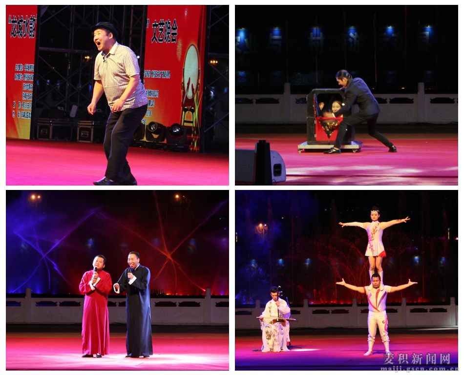文藝演出在激情飛揚(yáng)、動(dòng)感十足的開(kāi)場(chǎng)舞蹈《龍騰盛世 鼓韻麥積》中拉開(kāi)了序幕,歌舞《點(diǎn)亮未來(lái)》、《我相信》、《美麗家園》、《大地情深》、《你最珍貴》、《說(shuō)伏羲》、《盛世花開(kāi)》、《中華我的家》等節(jié)目唱響了社會(huì)主義核心價(jià)值觀主旋律,歌頌了人民群眾愛(ài)黨愛(ài)國(guó)和對(duì)美好平安幸福生活的向往;詩(shī)詞朗誦《我的中國(guó)夢(mèng)》以平實(shí)、樸素的語(yǔ)言表演,贏得了觀眾陣陣掌聲;葫蘆絲合奏《雪域踢踏》、雙人雜技《力量與美》、魔術(shù)《幻影》和相聲《仿生學(xué)》等節(jié)目,精湛的藝術(shù)表演,吸引了觀眾凝神定氣的觀看,演出現(xiàn)場(chǎng)歡呼喝彩聲此起彼伏連連不斷;獨(dú)角戲《找假牙》節(jié)目將整個(gè)演出推向了高潮。最后,演出活動(dòng)在大合唱《共筑中國(guó)夢(mèng)》拉下帷幕。