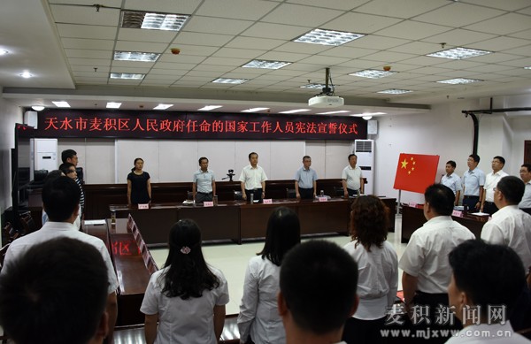 根據(jù)《天水市麥積區(qū)人民政府任命的國家工作人員憲法宣誓實施辦法》規(guī)定,7月31日,麥積區(qū)政府采取集體宣誓的形式,舉行新任命國家工作人員就職憲法宣誓儀式。區(qū)委副書記、區(qū)長成少平主持宣誓儀式,區(qū)領(lǐng)導(dǎo)周岳紅、高福光、樊華、成紅梅、杜根祥、王啟峰、趙國平、李樹武、鄭曉陽出席儀式。
