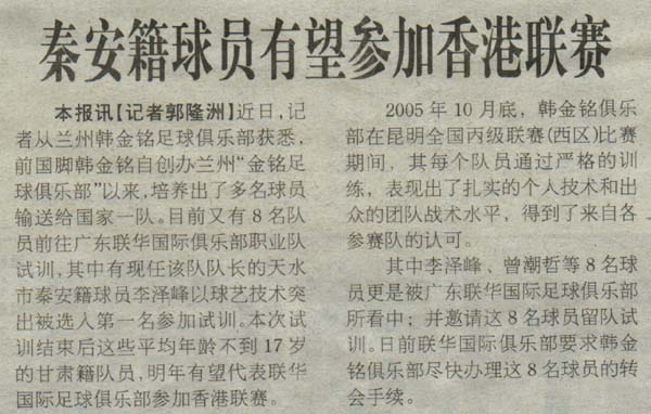 本報(bào)訊【記者郭隆洲】近日,記者從蘭州韓金銘足球俱樂部獲悉,前國腳韓金銘自創(chuàng)辦蘭州“金銘足球俱樂部”以來,培養(yǎng)出了多名球員輸送給國家一隊(duì)。目前又有8名隊(duì)員前往廣東聯(lián)華國際俱樂部職業(yè)隊(duì)試訓(xùn),其中有現(xiàn)任該隊(duì)隊(duì)長的天水市秦安籍球員李澤峰以球藝技術(shù)突出被選入第一名參加試訓(xùn)。本次試訓(xùn)結(jié)束后這些平均年齡不到17歲的甘肅籍隊(duì)員,明年有望代表聯(lián)華國際足球俱樂部參加香港聯(lián)賽。