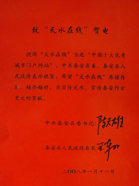 中共秦安縣委員會(huì) 秦安縣人民政府電賀天水在線榮獲“中國(guó)十大優(yōu)秀城市門戶網(wǎng)站”