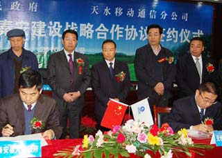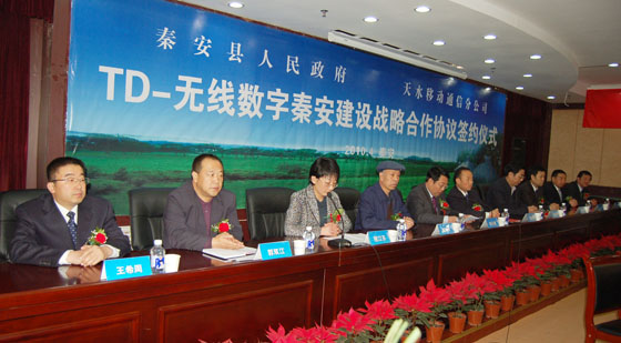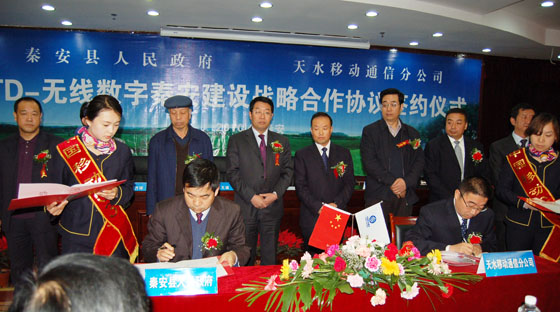 經(jīng)秦安縣政府和中國移動天水分公司的深入?yún)f(xié)商,秦安縣人民政府與中國移動天水分公司的戰(zhàn)略合作框架協(xié)議已經(jīng)正式形成。2010年4月8日,TD-無線數(shù)字秦安建設戰(zhàn)略合作協(xié)議簽約儀式在縣行政中心舉行。中國移動天水分公司總經(jīng)理張嘉祥,中國移動天水分公司紀檢書記、工會主席楊琦,中國移動天水分公司副總經(jīng)理王希周、白建濤,秦安縣委書記陳天雄,縣人大主任賈萬祥,縣政協(xié)主席高霆鈞,縣委副書記程江芬,縣委常委、副縣長李全明,縣政府副縣長郭雙江以及各鄉(xiāng)鎮(zhèn)黨委書記、縣直有關單位和企業(yè)負責人參加了簽約儀式。