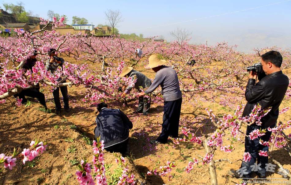 最是三月風(fēng)光好,桃林春色染秦安,千樹萬樹桃花開,千人萬人游園來。4月21日(周六),天水在線一行在秦安縣委宣傳部副部長、縣文明辦主任王建祥和劉坪鄉(xiāng)鄉(xiāng)長何國喜的陪同下,走進秦安縣劉坪鄉(xiāng)何灣萬畝綠色標準化蜜桃生產(chǎn)示范基地攝影采風(fēng)。這也是天水在線2012年開展的第五次大型攝影采風(fēng)活動。(天水在線2012年“一號行動”:走進大地灣<秦安縣>;天水在線2012年第二號行動:頂風(fēng)踏雪走古坡<甘谷縣>; 天水在線2012年第三號行動:臥牛山里耍旋鼓<武山縣>;天水在線2012年四號行動:聚焦穎川河流域綜合開發(fā)<麥積區(qū)>)