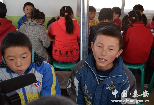 當我們來到大莊小學(xué)時,正好碰上中午學(xué)生們吃早餐的時間,走進食堂,看到食堂寬敞明亮,桌椅整齊潔凈,學(xué)生組長和老師們正在往桌子上擺放早餐奶和雞蛋。筆者問一位正在用餐的學(xué)生:“學(xué)校食堂怎么樣?”“非常棒!自從去年省上的叔叔阿姨們來了后,為我們建起了這座漂亮的大房子后,我們現(xiàn)在吃營養(yǎng)餐舒服多了。”六年級高亞杰回答道。