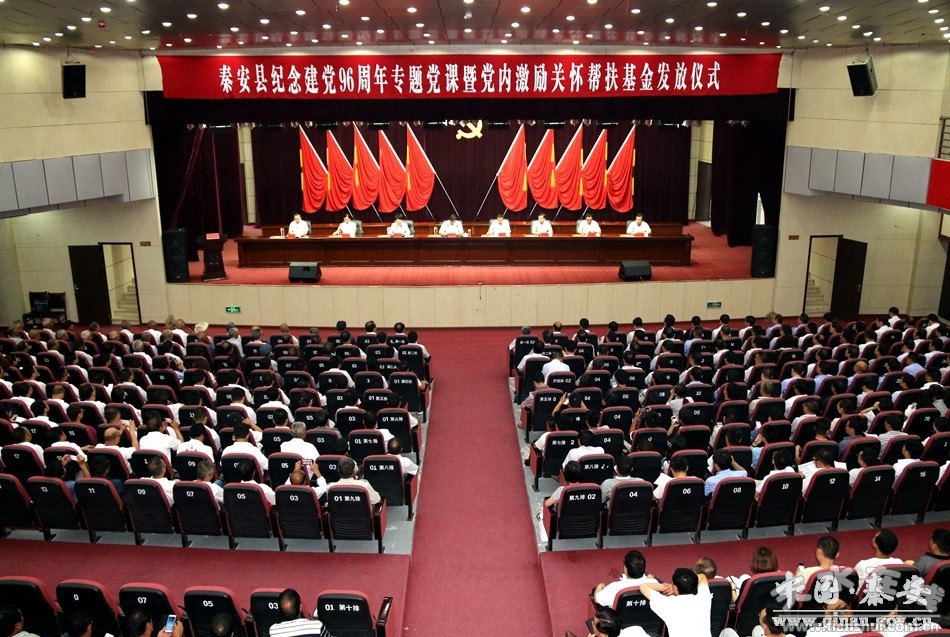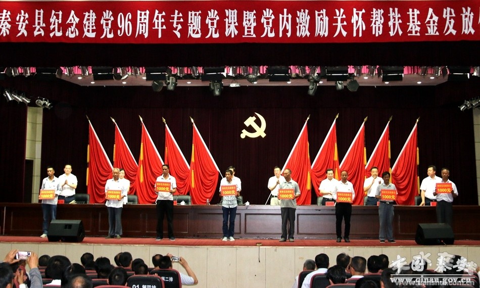 6月26日下午,秦安縣舉行紀(jì)念建黨96周年專題黨課暨黨內(nèi)激勵關(guān)懷幫扶基金發(fā)放儀式。縣委書記王東紅,縣人大常委會主任郭海軍,縣委副書記、縣長程江芬及縣四大組織其他黨員領(lǐng)導(dǎo)干部、法檢兩長;各鎮(zhèn)鎮(zhèn)長、黨委副書記、黨建辦主任、組織干事;縣直各黨(工)委書記、副書記、部分支部書記,縣直機(jī)關(guān)工委所屬各黨組織書記;黨內(nèi)激勵關(guān)懷幫扶機(jī)制享受對象,專職化村黨支部書記450多人參加了會議。