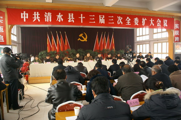 (清水縣委對外宣傳辦公室 劉海仙 楊兆康)1月17日上午,中共清水縣委第十三屆三次全委擴(kuò)大會議在軒轅賓館北二樓會議室隆重召開。大會的主要任務(wù)是以黨的十七大精神和科學(xué)發(fā)展觀為指導(dǎo),貫徹落實中央經(jīng)濟(jì)工作會和省、市全委會暨經(jīng)濟(jì)工作會議精神,回顧總結(jié)去年以來該縣經(jīng)濟(jì)社會發(fā)展情況和黨的工作,全面安排部署2008年的各項工作。全體縣委委員、候補(bǔ)委員;全體紀(jì)委委員;不是縣委委員、候補(bǔ)委員的在職縣級干部;各鄉(xiāng)鎮(zhèn)黨委書記(鄉(xiāng)鎮(zhèn)長)、人大主席、副書記,縣直各部門黨政主要領(lǐng)導(dǎo),縣人大、政協(xié)各工委負(fù)責(zé)人,省、市駐清單位主要領(lǐng)導(dǎo)等共230多人參加了會議。
