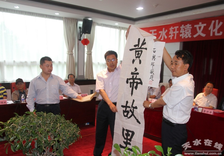 (中國(guó)儒文化協(xié)會(huì)籌備小組秘書長(zhǎng)、陜西黃帝文化研究院學(xué)術(shù)院長(zhǎng)孫興華代表中國(guó)著名考古學(xué)家石興邦先生贈(zèng)送“軒轅故里”題詞作品)