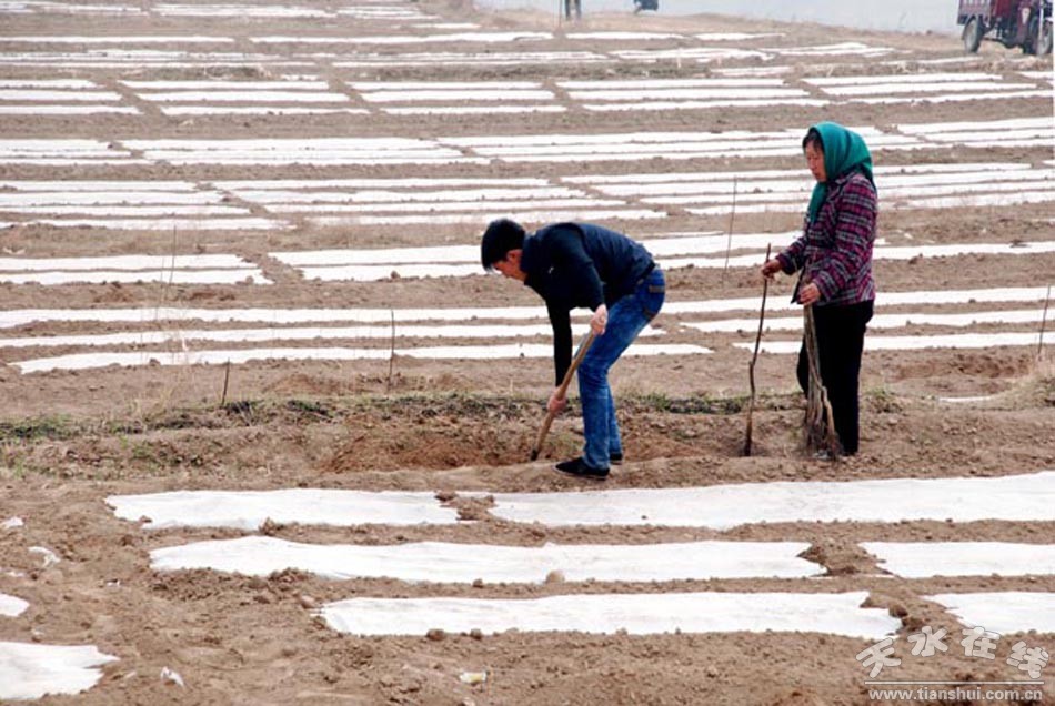 圖為清水縣紅堡鎮(zhèn)村民正在自家的全膜雙壟溝播玉米地里套種核桃樹。