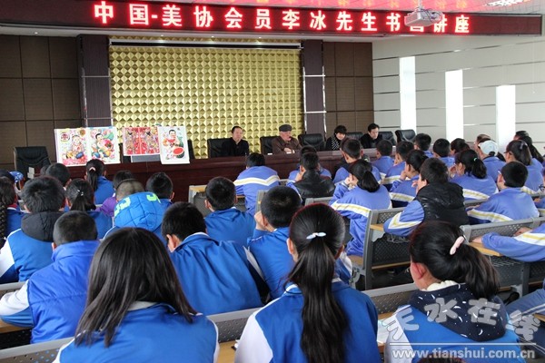 當天下午,李冰先生走進清水三中,舉辦了書畫藝術進校園活動專題講座,與青少年書法、美術愛好者共同交流、探討,普及書畫藝術、推廣書畫藝術,讓更多的人特別是青年學生了解、熱愛、弘揚中國傳統(tǒng)書畫藝術。