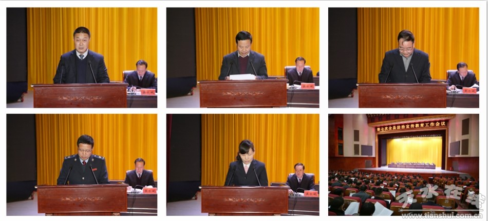 縣四大組織在家領(lǐng)導,天水市司法局政治部主任駱宏勝,法院院長,檢察院檢察長,公安局局長、政委出席會議;18鄉(xiāng)鎮(zhèn)黨委書記、鄉(xiāng)鎮(zhèn)長、分管領(lǐng)導、司法所全體干部,6個社區(qū)負責人,縣直各部門單位負責人,公安局、法院、檢察院、司法局干警,縣直各幼兒園、中小學校、一中、六中、特教學校負責人,18鄉(xiāng)鎮(zhèn)學區(qū)、中學校長,天河酒業(yè)、華盛農(nóng)業(yè)等企業(yè)負責人,宗教場所負責人,榮獲縣“六五”普法的先進個人參加了會議。