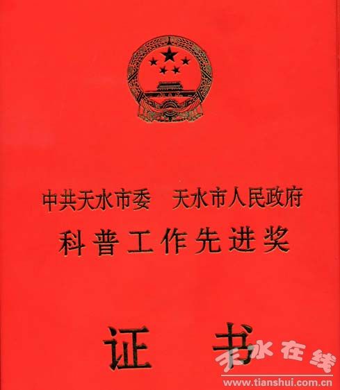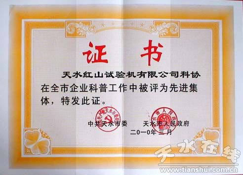3月30日,中共天水市委、市政府隆重召開全市科技獎勵大會,表彰獎勵了在全市企業(yè)科普工作中作出突出成績的先進集體和個人,天水紅山試驗機有限公司科學(xué)技術(shù)協(xié)會被評為2008~2009年度企業(yè)科普工作先進集體。