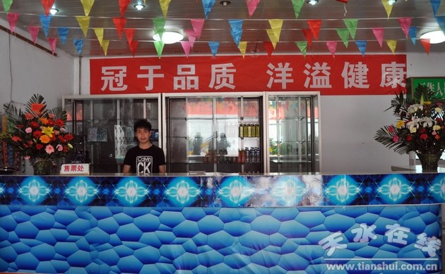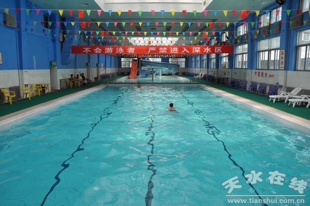 天水賓館游泳館地處天水賓館院內(nèi),建筑面積3020平方米,場(chǎng)地面積1500平方米,泳池為65×25平方米,泳道8條,分淺水和深水兩區(qū),水深0.6-2.2米,標(biāo)準(zhǔn)水溫:29-26℃,是市內(nèi)為數(shù)不多的采用石英砂過(guò)濾技術(shù)的標(biāo)準(zhǔn)池之一。館內(nèi)配備全套水循環(huán)系統(tǒng)和次氯酸鈉消毒系統(tǒng)。并有男女更衣室、淋浴間、游泳館平時(shí)除游泳教學(xué)訓(xùn)練、承接全市游泳比賽外,也對(duì)社會(huì)開(kāi)放,不限時(shí)每人每次20元。