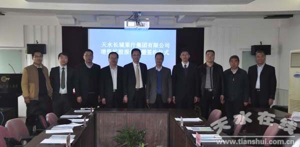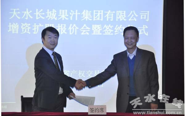 11月9日,長城電工天水長城果汁集團有限公司增資擴股報價會暨簽約儀式在甘肅省產權交易所舉行。投資方甘肅省國有資產投資集團有限公司投資業(yè)務部總經理郝勇、投資經理李建泰 ,浙江浙銀資本管理有限公司總經理孫冠名,嘉興中恩投資合伙企業(yè)中國民生銀行蘭州分行副行長代欽、企業(yè)金融七部經理王明楷 ,出席簽約儀式。