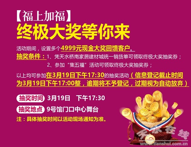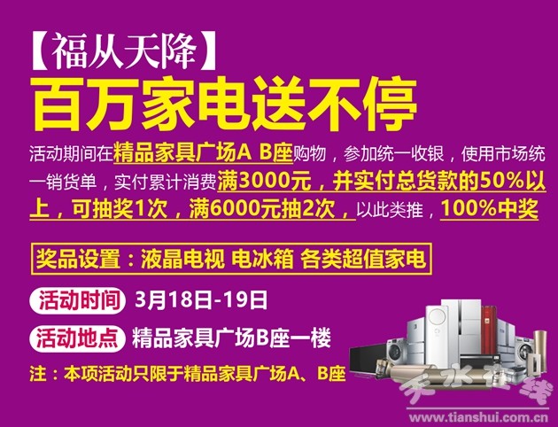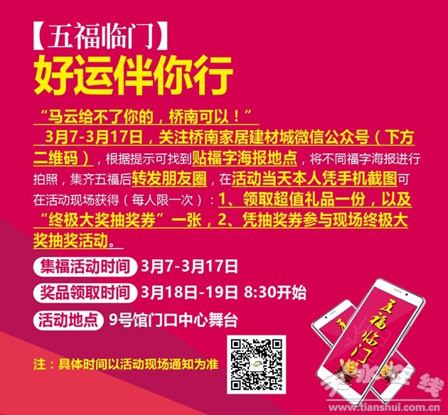 隨著3月15日“國際消費者權(quán)益日”的到來,天水橋南家居建材城作為天水市最大的家居建材綜合賣場,“誠信315 服務(wù)365——吉年鉅惠福到萬家”主題活動精心籌備中;顒又荚跒樘焖爸苓厖^(qū)域消費者提供全面、優(yōu)質(zhì)、綠色、環(huán)保的家居建材,在滿足各層次消費者需求的同時,以實際行動引領(lǐng)家居行業(yè)商家誠信服務(wù),讓消費者在橋南的購物省心、放心、舒心。