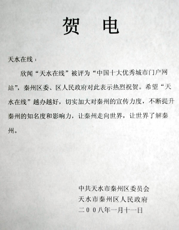 中共天水市秦州區(qū)委員會(huì) 秦州區(qū)人民政府電賀天水在線榮獲“中國十大優(yōu)秀城市門戶網(wǎng)站”