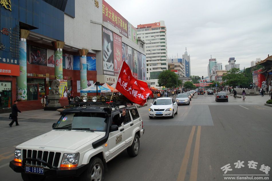 (圖為2009年5月24日天水在線走進(jìn)煙鋪大櫻桃基地品嘗大櫻桃活動車隊穿越城區(qū))