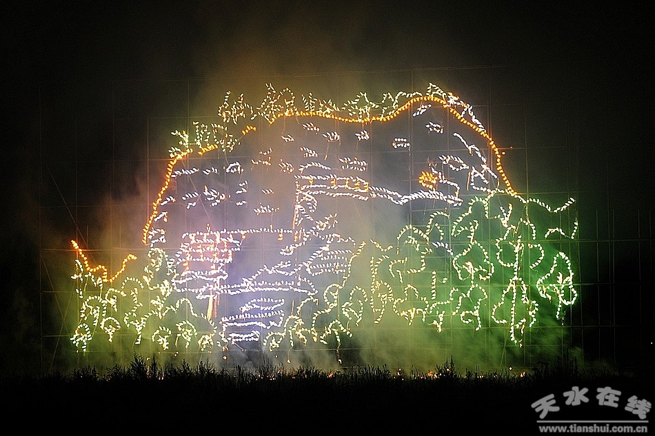 晚九點(diǎn)整,音樂焰火晚會正式拉開了序幕。綠牡丹、黃千輪、金波藍(lán)、色連珠花以及各式中空禮花,穿插特效花束、燭光、虎尾等組合電腦特技表演的效果,活力四射、青春律動、把和諧之美展示無余。絢爛的焰火爭奇斗艷,相互輝映,映亮了整個秦州夜空。