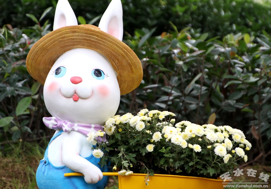 在虛擬養(yǎng)老院門前南北通道處放置10組姿態(tài)各異的造型萌萌兔,木質(zhì)秋千1組、卡通花樹3組、卡通娃娃5個,以童心、童趣為中心,周圍設(shè)置大小、顏色不一的圓形花球,下層以小菊點(diǎn)綴草坪,形成色彩斑斕的“七彩童年”展區(qū)。