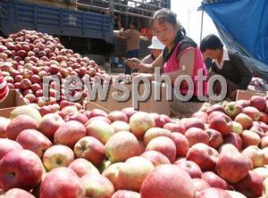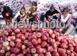 2005年9月7日,甘肅省天水市花牛村果農在分揀蘋果。