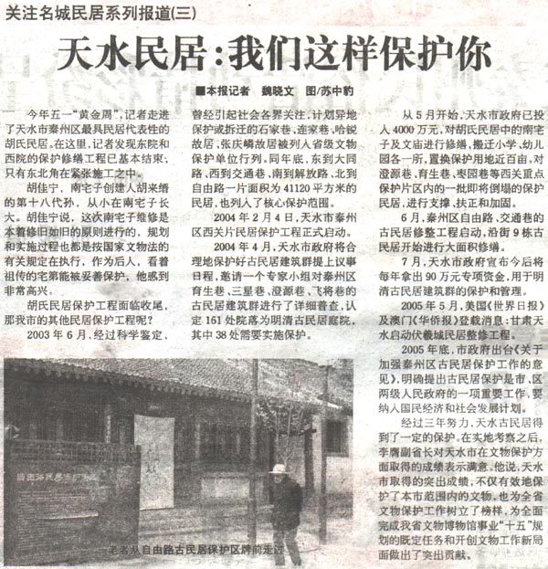 2005年底,市政府出臺《關(guān)于加強秦州區(qū)古民居保護(hù)工作的意見》,明確提出古民居保護(hù)是市、區(qū)兩級人民政府的一項重要工作,要納入國民經(jīng)濟(jì)和社會發(fā)展計劃。