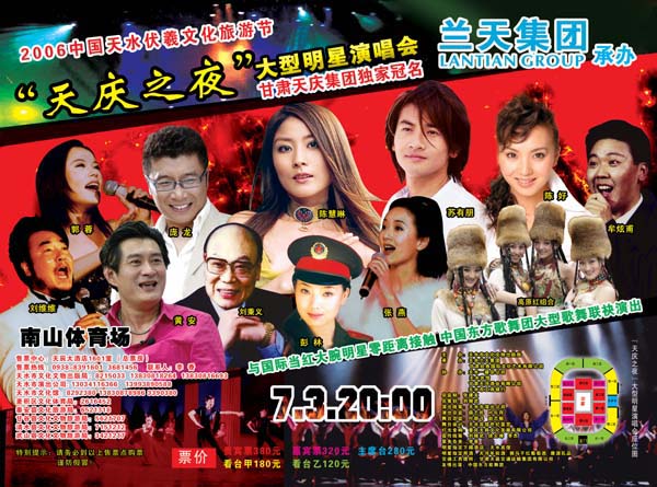 “天慶之夜”大型明星演唱會(huì)是2006年中國天水伏羲文化旅游節(jié)的一項(xiàng)重要的文化活動(dòng)。此次活動(dòng)由甘肅天慶集團(tuán)獨(dú)家冠名,市文化文物出版局主辦,天水蘭天集團(tuán)、甘肅經(jīng)典國際之化藝術(shù)有限公司承辦,將于7月3日晚8時(shí)在南山體育場舉行。屆時(shí)陳慧琳、蘇有朋、陳好、龐龍、張燕、郭蓉、劉秉義、牟炫甫、劉維維、黃安、高原組合等港臺、內(nèi)地明星將聯(lián)袂演出,在國內(nèi)外享有盛譽(yù)的中國東方歌舞團(tuán)將作為演唱會(huì)的舞蹈班底加盟演出!疤鞈c之夜”大型明星演唱會(huì)門票有貴賓票、嘉賓票、主席臺票、看臺甲票和看臺乙票五種,總票房在天辰大酒店,市文化文物出版局、市演出公司、市文化館設(shè)有分票房。