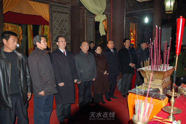 正月十六,是人文始祖太昊伏羲氏的誕辰。當日零時,由民間組織舉辦的“2007(丁亥)年民間祭祀伏羲活動”在伏羲廟正式開始,市領(lǐng)導(dǎo)張廣智、孫周秦、李美華,市長助理彭鴻嘉參加了祭祀活動。 (記者 閆鵬飛攝)