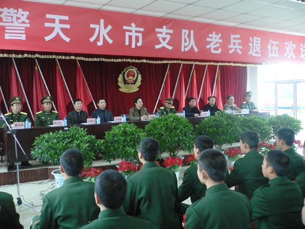 11月25日,天水市武警支隊(duì)的190多名戰(zhàn)士光榮退伍,市武警支隊(duì)召開(kāi)歡送退伍戰(zhàn)士大會(huì)。省武警總隊(duì)副參謀長(zhǎng)何光榮、副市長(zhǎng)楊維俊出席會(huì)議并講話。