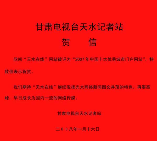 欣聞“天水在線”網(wǎng)站被評(píng)為“2007年中國十大優(yōu)秀城市門戶網(wǎng)站”,特致信表示祝賀。