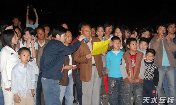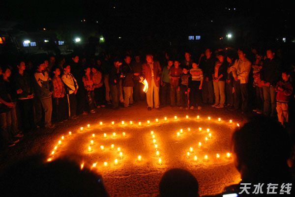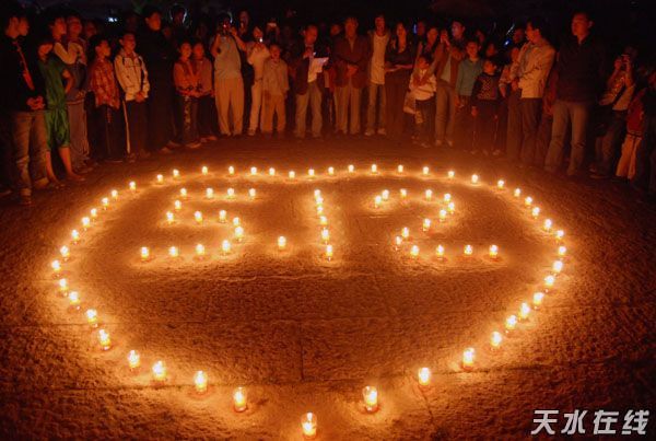汶川大地震波及到天水,出現(xiàn)山體滑坡、房屋倒塌、交通受阻、通訊中斷,我市人民的生命財(cái)產(chǎn)亦受到嚴(yán)重威脅。為了送別數(shù)萬逝去的亡靈,為了企求災(zāi)難盡快過去,為了給與災(zāi)難進(jìn)行殊死斗爭的災(zāi)區(qū)人民盡一點(diǎn)力所能及的力量,天水文學(xué)界部分人士及天水在線部分網(wǎng)友200余人定于5月18日晚8時(shí),自發(fā)組織會(huì)聚我市伏羲廣場,在中華民族人文始祖伏羲氏面前,為災(zāi)區(qū)人民及我市人民禳災(zāi)祈福,為此次災(zāi)難中逝去的遇難者同胞志哀。