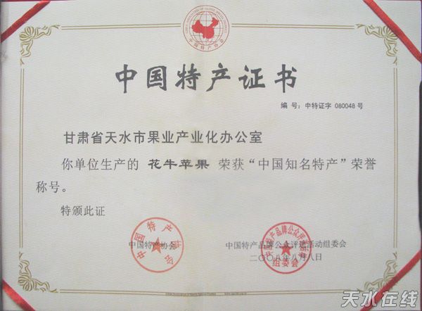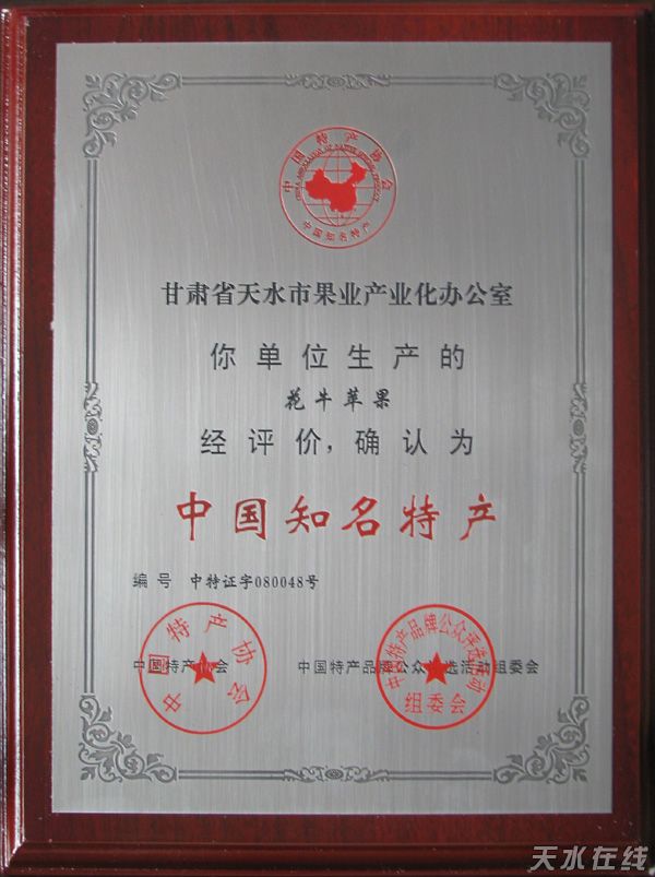 日前,由中國(guó)特產(chǎn)協(xié)會(huì)、中國(guó)食文化研究會(huì)等多家單位聯(lián)合并通過(guò)中國(guó)特產(chǎn)營(yíng)銷網(wǎng)、中國(guó)特產(chǎn)博覽網(wǎng)等數(shù)十家媒體開(kāi)展的“中國(guó)特產(chǎn)品牌公眾評(píng)選活動(dòng)”落下帷幕,天水市果業(yè)產(chǎn)業(yè)化辦公室推選的花牛蘋(píng)果,在全國(guó)近500種地方特產(chǎn)中,經(jīng)過(guò)3個(gè)多月網(wǎng)上的激烈角逐,花牛蘋(píng)果以10萬(wàn)余票的高得票率名列評(píng)選活動(dòng)的前茅,榮獲“中國(guó)知名特產(chǎn)”稱號(hào)。并由中國(guó)特產(chǎn)協(xié)會(huì)和中國(guó)特產(chǎn)品牌公眾評(píng)選活動(dòng)組委會(huì)共同頒發(fā)了中國(guó)知名特產(chǎn)獎(jiǎng)牌及證書(shū)。