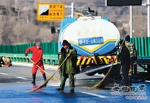 在康臨高速公路南陽(yáng)山隧道附近,工人們正在忙著清洗路面,翠綠色的隔離帶中間不時(shí)有施工工人的身影穿梭其中,機(jī)聲隆隆,笑語(yǔ)不斷,施工秩序井然,剛剛鋪好的瀝青路面上還泛著陣陣熱氣……收尾工作在有條不紊地進(jìn)行中。