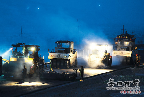 車輛行使不遠(yuǎn)進(jìn)入另一標(biāo)段施工現(xiàn)場(chǎng)時(shí)太陽(yáng)已經(jīng)落山,高速公路兩邊山村里也早已燈火通明,大多數(shù)人們都已經(jīng)回到溫暖的家中,而夜幕下的高速公路施工路面上卻還是燈火通明、人影涌動(dòng),為了盡早完工,工人們幾乎每天都在加班加點(diǎn)。施工現(xiàn)場(chǎng)的溫度明顯比市區(qū)低了許多,工人們穿著厚厚的棉衣在施工。記者上前詢問一位名叫陳磊的鋪路機(jī)駕駛員冷不冷時(shí),陳磊卻干勁十足地回答說:“身體雖然有些冷但心里是熱乎的,每看到自己一米一米鋪出的高速公路,就有一種成就感,身上就有使不完的勁兒”。